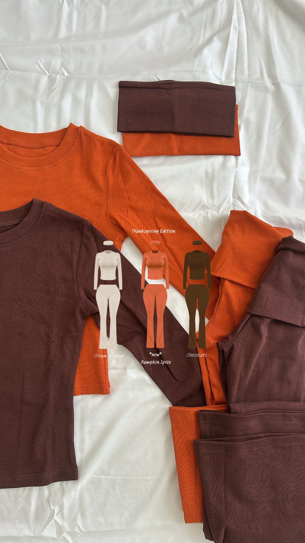 Our best-selling Fold Over Yoga Pants + Long Sleeve Top are back — now in Pumpkin spice, fall’s most-wanted shade.